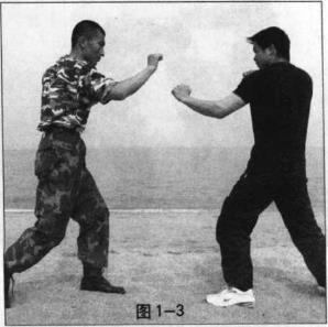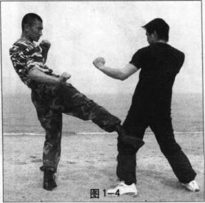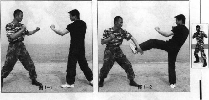 敌我双方以格斗式对峙(图1-我先用左手向下拍开对方攻来的左前踢腿(图1-2)我应向左侧转腰准备攻出右脚(图1-3)