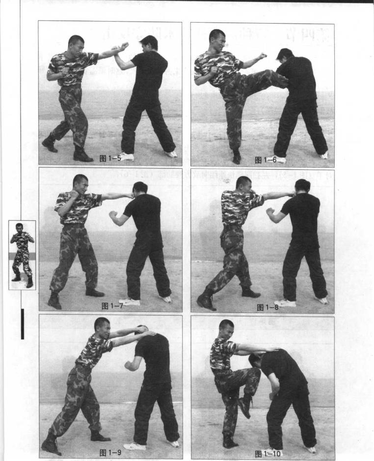 左直拳击敌面部(图1-7)右直拳连续狠击敌面部(图1-8)双手猛力向下按压敌头部(图1-9)右膝茬快速向上迎撞敌面部或胸部要害处(图1-10)