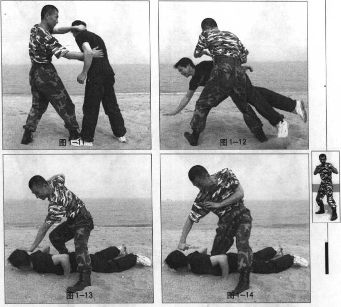 将左脚后收落地右手插入敌左肋下并按住其背左手则按其后颈(图1-11)向左转体双手猛然向左后方将对手牵摔出去(图1-12)对方倒地后需用左手按住其头部(图1-13)右重拳狠狠砸向敌方头部予以致命性创击(图1一14)。