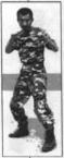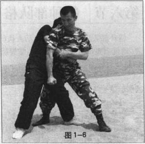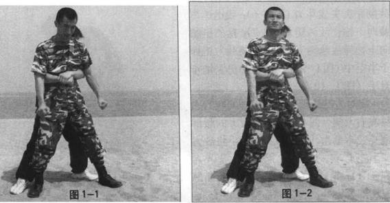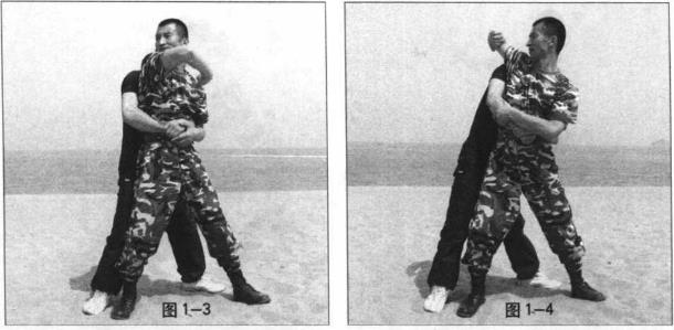 当敌由后抱住我腰部时(图1-1)我方速将头部向后猛撞敌面部(图1-2)接下来迅速挥起右肘(图1-3)将右肘向后狠狠撞向敌头部(图1-4)迅速将右脚后收并插到敌方两腿后面用以控制敌重心(图1-5)