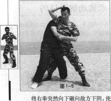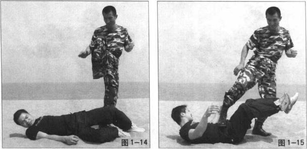 将对方的腰部狠狠往下砸向我的右膝或右大腿(图1-11)使敌方的腰部遭受致命创击(图1-12)松手将敌方摔于地上(图1-13)迅速向上提起右脚(图1-14)将右脚重重踩向敌面部或胸部要害处将其制服(图1-15)。