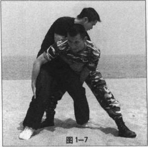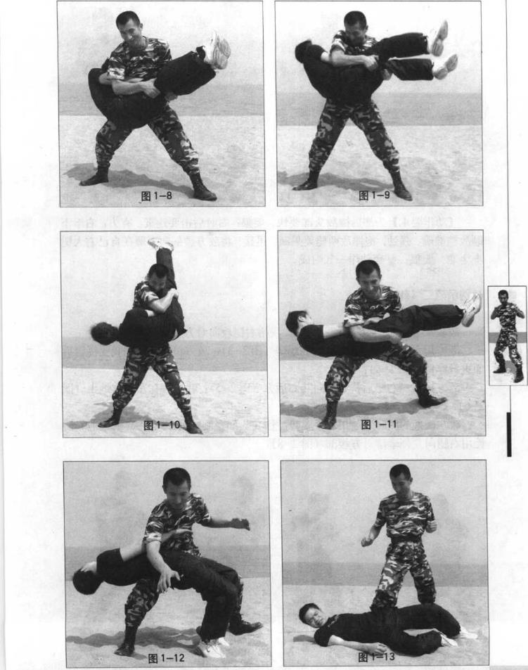 敌彻底丧失战斗力(图1-6)我迅速弯腰向下抱住敌两腿(图1-7)猛然挺腰向上抱摔敌两腿(图1-8)将敌方抱摔于半空中(图1-9)在半空中仍需抱牢对手(图1—10)
