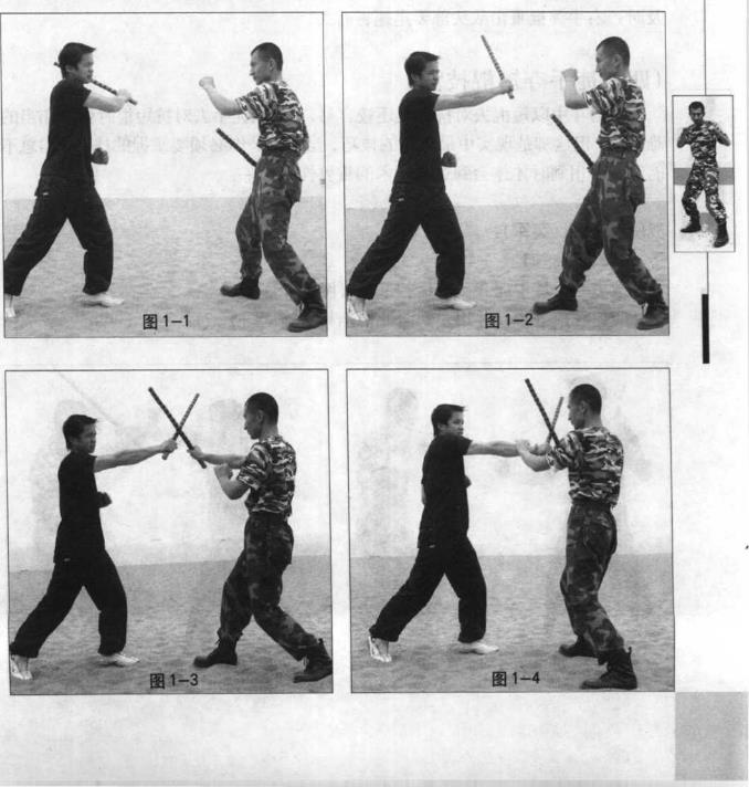 我右手握棍准备格挡对方的攻击(图1-敌方将右手中的棍挥起向我头部反扫(抽)过来(图1-2)我速将右手中的棍挡向右侧去格击对手的棍(图1—3)