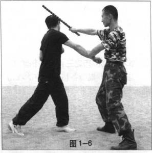 迅速用左手由外向内侧去抓握住敌方的右手腕(图1-4)在左手下压并后拉敌右腕的同时右手将棍挥起(图1-5)将右手中的棍重重劈(或反抽)向敌头部要害处一击制敌(图1-6)
