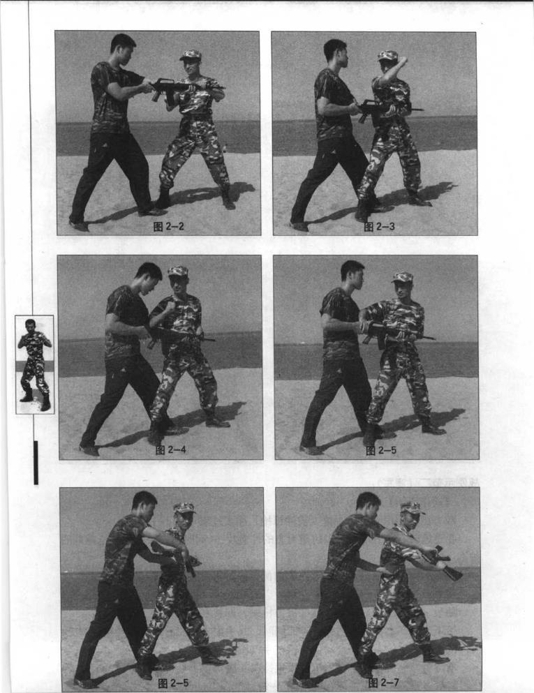 我迅速向右前方进右步以闪避对方的冲刺攻击,同时用左手抓握敌枪前部的护木(图2-2)