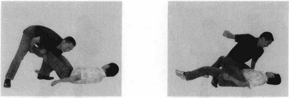 如果对手以拳攻你上段时你以左臂格挡然后迅速下潜以双臂从对手膝关节后的胭窝处抱住对手的双腿弗用肩部很狠地顶靠对手双腿用力撞击对手的腿将他摔倒在地。对手倒地后再骑到对手身上以拳头猛击对手面部将其制服(图2-161)
