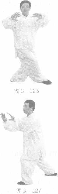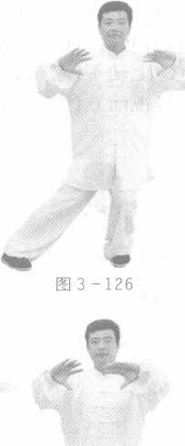 提示:图3 - 123、图3 - 124、图3 - 125是连续动 作,转身推掌同时完成。以上为左转蟹掌式。