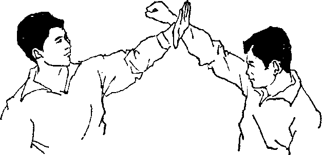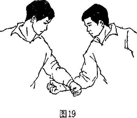 12,格压:左(右)臂屈肘,肘尖向外,拳心向内,小 臂由上向下格压对手小臂(图19).用于防对手拳,掌的击 打.