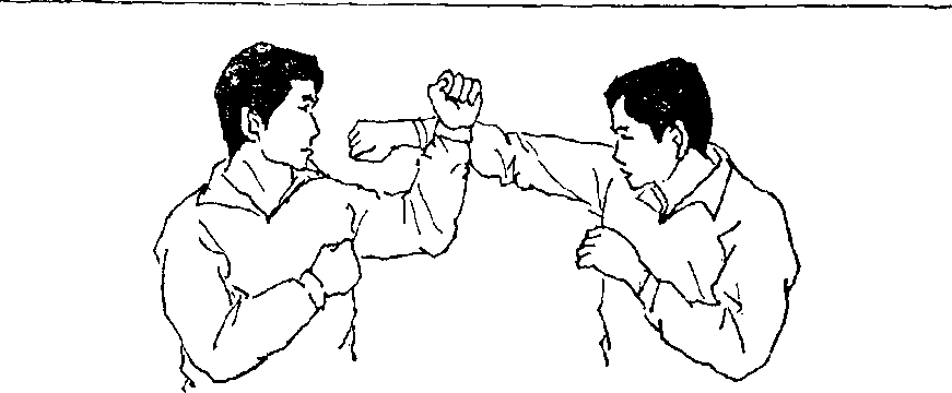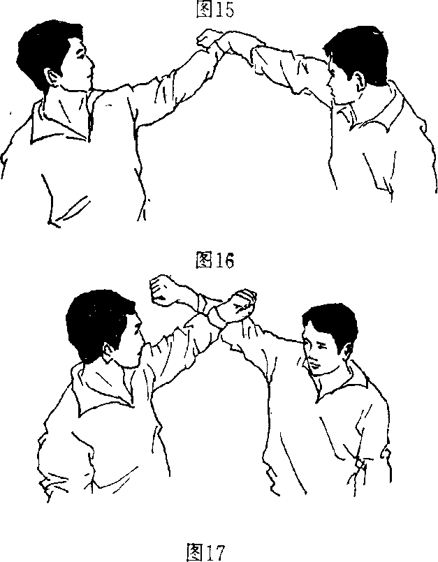 架挡:屈臂上举,拳心向外,由下向上以小臂架挡 对手小臂(图17)。用于防对手拳、掌的击打.