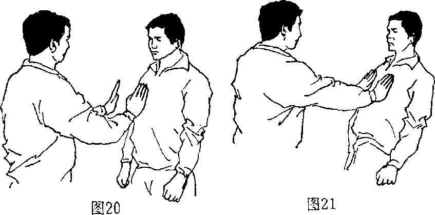 13.炖手:两臂屈肘,小臂上举,掌心向外(图20)双 手突然前推,力达全掌,小臂伸直(图21).用于手推对手 胸,背等部位。