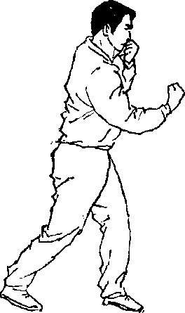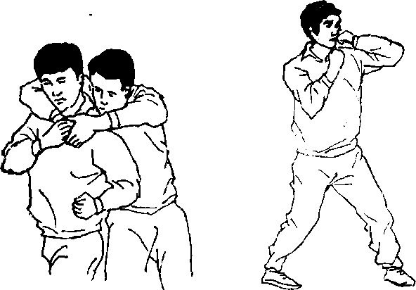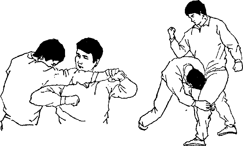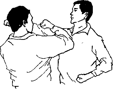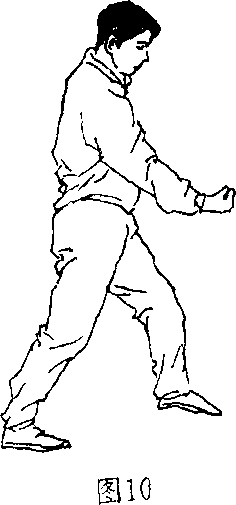 4 .砸拳:力发于腰部,直臂由上向下击砸,力达于拳背, 拳心向上(图10)。用于击打面部。