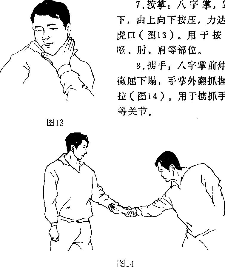 9.挡抓:屈臂上举,八字掌掌心向外,由左向右(由下 向上),以手腕或小臂下端,挡击对手手腕或小臂(图15); 手掌向外下翻,抓握对手手腕(肘)关节(图16)。用于防 对手拳、掌的击打或用于摔法前的准备。