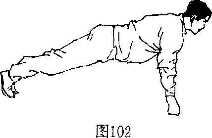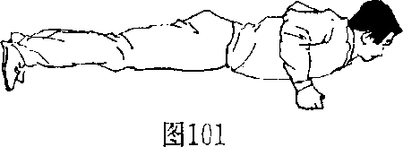 1 ,拳面撑:身体正直 俯卧,脚尖和拳面撑地使 身体离开地面(图101), 臂屈伸身体上下起落(图