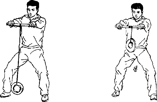 7 .卷木棒:木棒约30公分,中部拴一绳,下面吊挂一 重物(图111),两臂前伸,双手握木棒两端卷拧重物起落 (图112),反复练习。用于增强手腕及臂的力量。