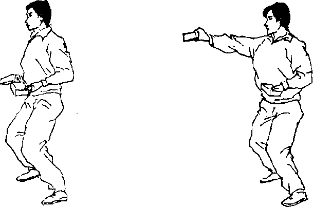 8 .推砖:马步站立,双手各握一砖,手心向上置于腰 间(图113),双手交替向前推出,臂伸直时拳心向下(图 H4),反复练习;用于增强手腕的握力及臂的力量.