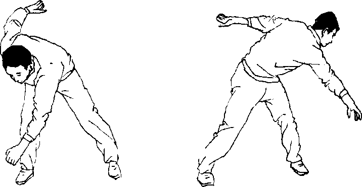 1,涮腰:由立正姿势开始,两脚开立,左右臂伸展开; 然后,左臂自然下垂,右臂向后伸,上体前倾(图139)。 以髓关节为轴,左臂左摆向背后伸,上体左倾仰头(图140)。 上体右倾,右臂由左上向右下摆,伸向右背上,左臂由左背 后向右上方摆(图141 ),左右两边交替反复练习。用于增 强腰部的灵活性,