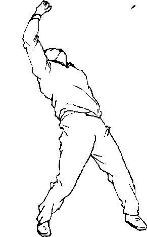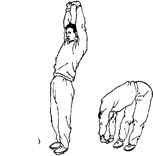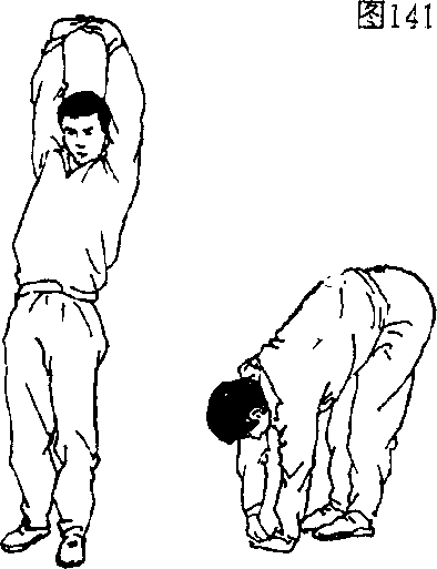 上举(图146),上体前屈,两手在体侧左、右接触地面