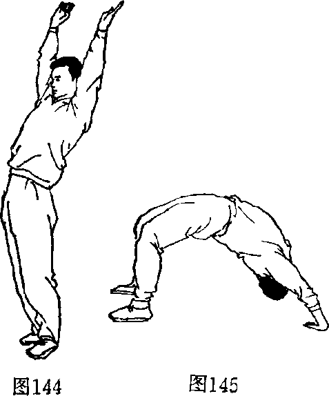 ②后下腰:由立正站立 姿势开始,两臂上举(图 144),上体后仰,两手尽力 接触地面(图145)。反复