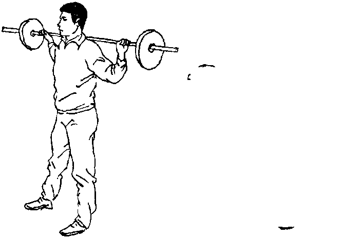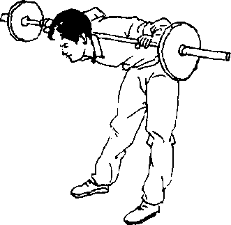 3.躬身:肩负杠铃,两脚开立略同肩宽(图148),双腿直 立,上体前倾(图149)。反复练习。用于增强腰部的力量。