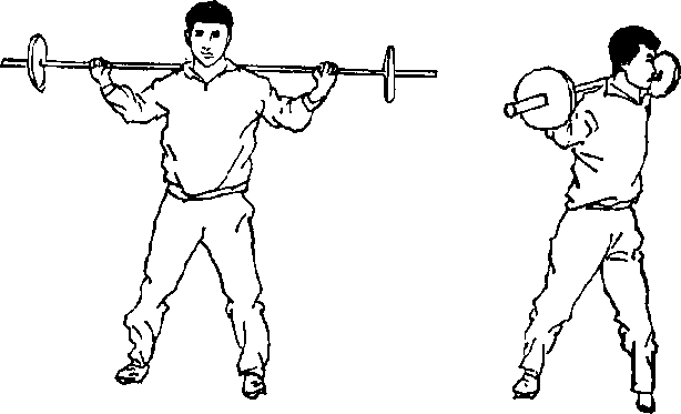 4.转体:肩负杠铃,两脚开立略同肩宽(图150),双 腿不动,上体向左右转动(图151 ),反复练习。用于增强 腰部的力量。