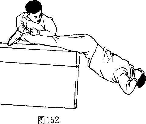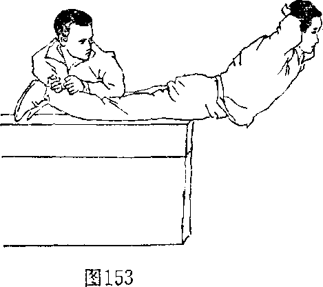 5,弹腰:下肢放于宽长凳上,两腿固定(图152),双 手后抱颈部,上体由下向上抬起(图153)。反复练习。用于 增强腰部的力量。