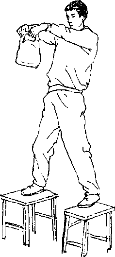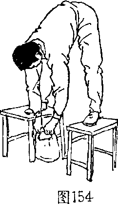 6 .提壶铃:两脚站立凳上,两腿伸直,上体前屈,手提 壶铃(图154),上体抬起,两臂上提(图155),反复练 习.用于增强腰部的力量。