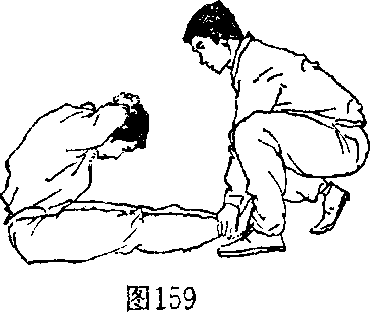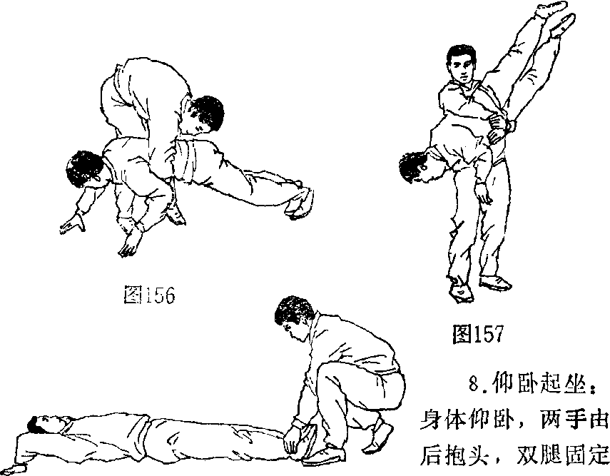 前屈坐起(图159),反复练习。用于增强腰、腹部的力量。