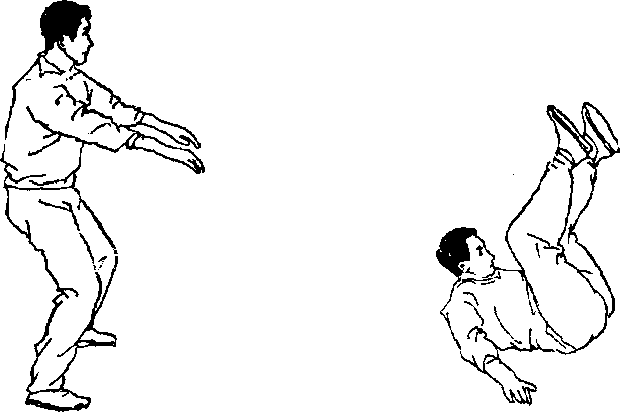 2,后倒;由立正姿势开始,两臂前摆,屈膝下蹲(图 165),自然后倒,臀、背、手臂依次触地,低头,两腿分 开屈膝向前上蹬(图166) ,用于向后倒地的自我保护或倒 地后反攻。