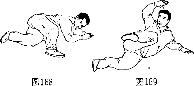 3.侧倒:由立正姿势开始,左腿 屈膝支撑,右腿前摆(图167),左 脚蹬地,同时身体右转倒地,左手臂 屈同身体左侧依次触地(图168), 倒地后左臂撑起(小臂支撑),右臂 上架,右腿上抬(图169),用于侧 向倒地的自我保护或倒地后反攻.