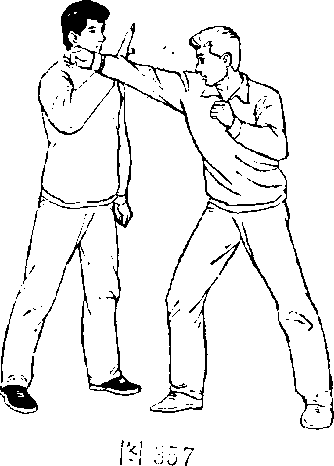 2 .左闪身,右手向上挡抓住乙右手腕(图357 ),