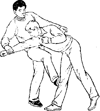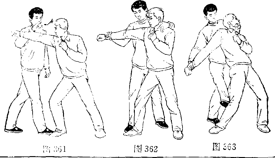 3 .抬右脚向前蹬拨乙右膝,右手向下拉其右手腕(图 359)。可把乙向前摔倒。