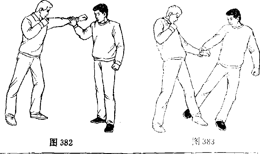 1 .左后闪身,屈右肘由里向外挡抓握住乙左手腕(图 382 )。