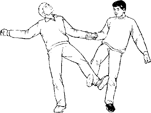 3.右脚向上勾踢乙左脚跟(图384)。可把乙向后摔倒图384动作要点说明:
