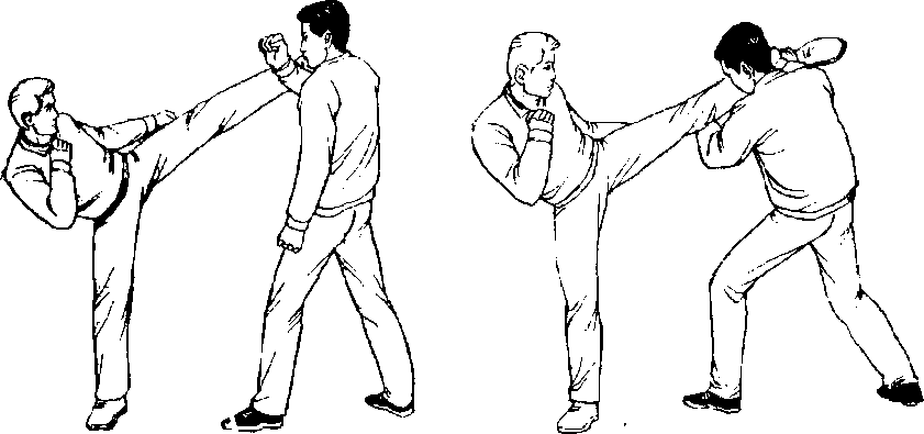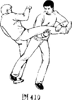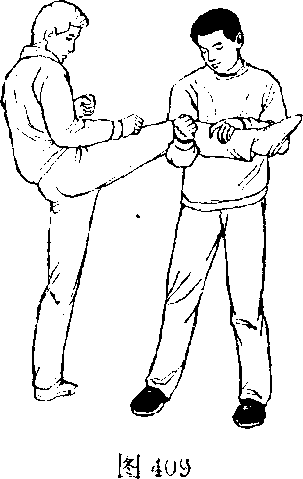 甲、乙双方搏击,乙起右 腿侧面踢甲左肩部(图408)。