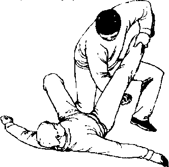 5 .上体前倾下压乙石大腿,右腿向后打(绊)乙左腿 (图411 )。可把乙向后摔倒.