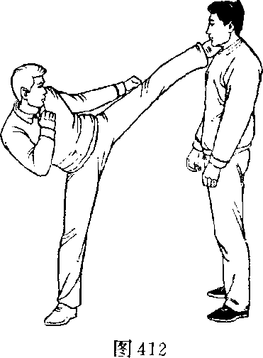 甲、乙双方搏击,乙起左 腿踢甲右侧颈部(图412 )。
