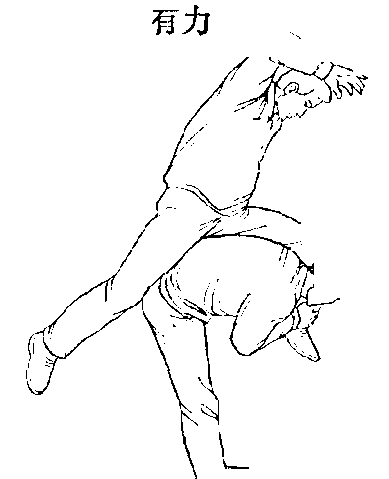 2 ,打腿、压腿合力把对手摔倒.