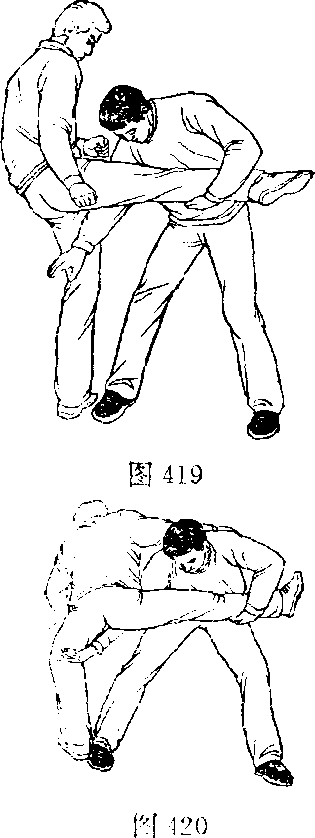 3 .右手由后向前拨乙左大 腿,胸压其右腿(图420)。 可把乙向后摔倒。