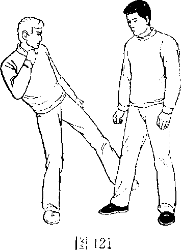 甲、乙双方搏击,乙起左腿勾踢甲右脚(图421 )。
