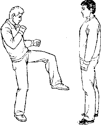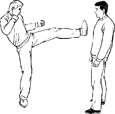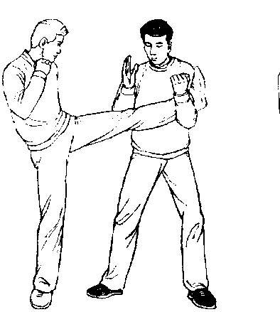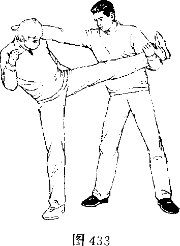 甲、乙双方搏击,乙起左脚正面蹬甲胸部(图431)。
