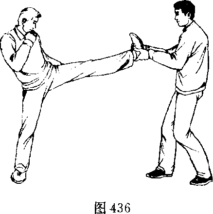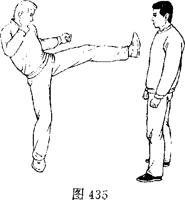 甲、乙双方搏击,乙抬左腿正面蹬甲胸部(图435)。