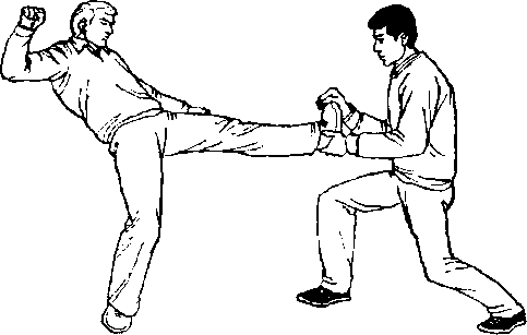 1 .后闪身向后撤左步,双手抓握住乙左脚(图436).