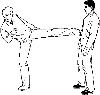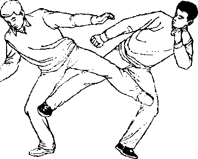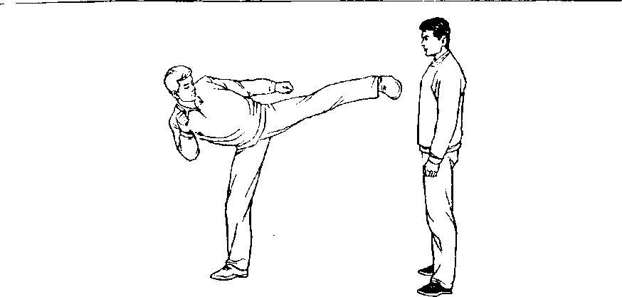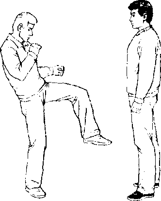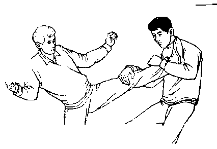 甲、乙双方搏击,乙正面抬左腿弹踢甲裆部(图442 )。