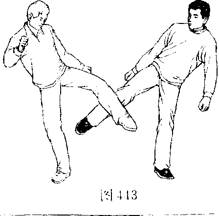 1 .当乙左脚尚未落地时,左转身,右腿迅速上抬前伸 (图443 )。