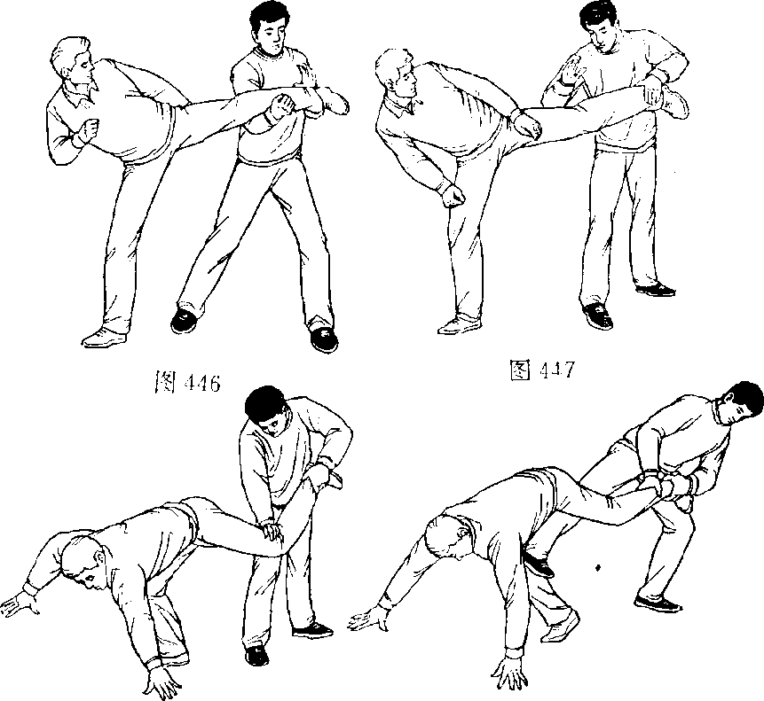1 .上右步左转身,双手架 抱住乙左小腿(图446)0