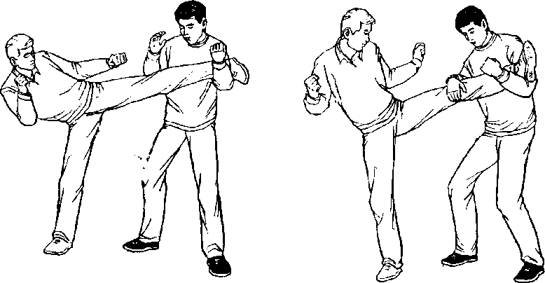 甲、乙双方搏击,乙抬左腿侧踹甲胸部(图450)0