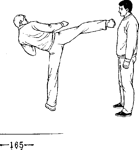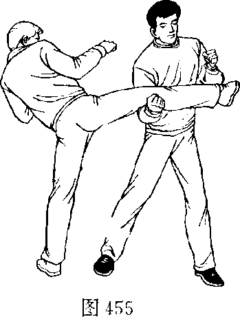 甲、乙双方搏击,乙拾右腿侧踹甲胸部(图454)。
