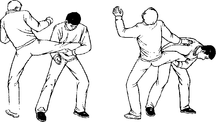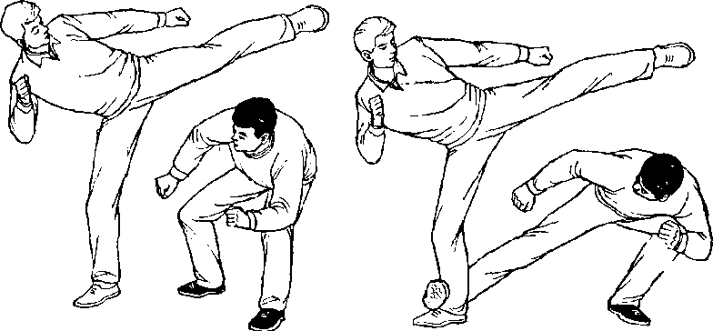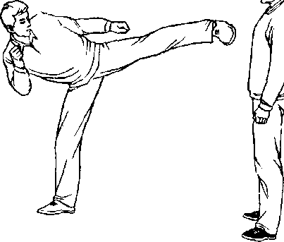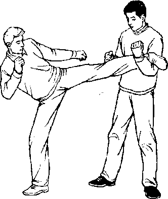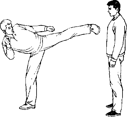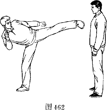 甲、乙双方搏击,乙抬左腿正面侧踹甲面部(图462 )。
