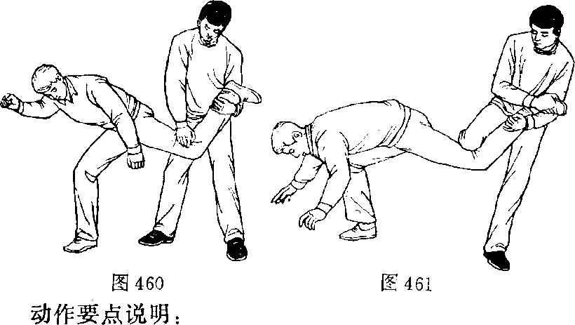 3 .右腿屈膝(替右手)跪压乙左膝窝(图461 )。可把乙 跪压向前摔倒并使其左膝受伤。