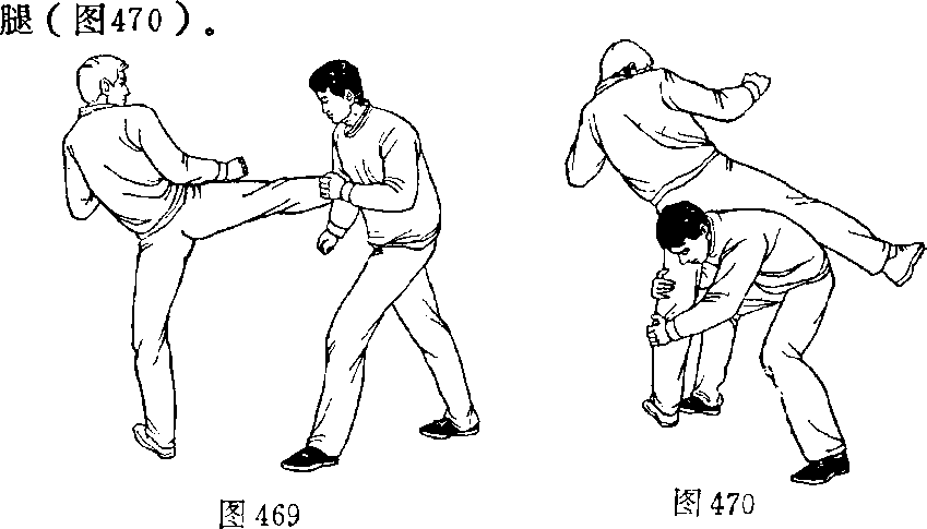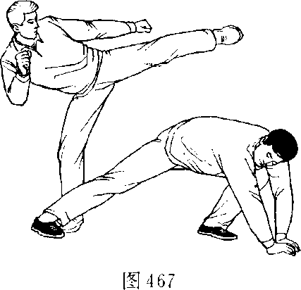 甲,乙双方搏击,乙正 面抬右腿侧踹甲胸部(图 468 ) 0